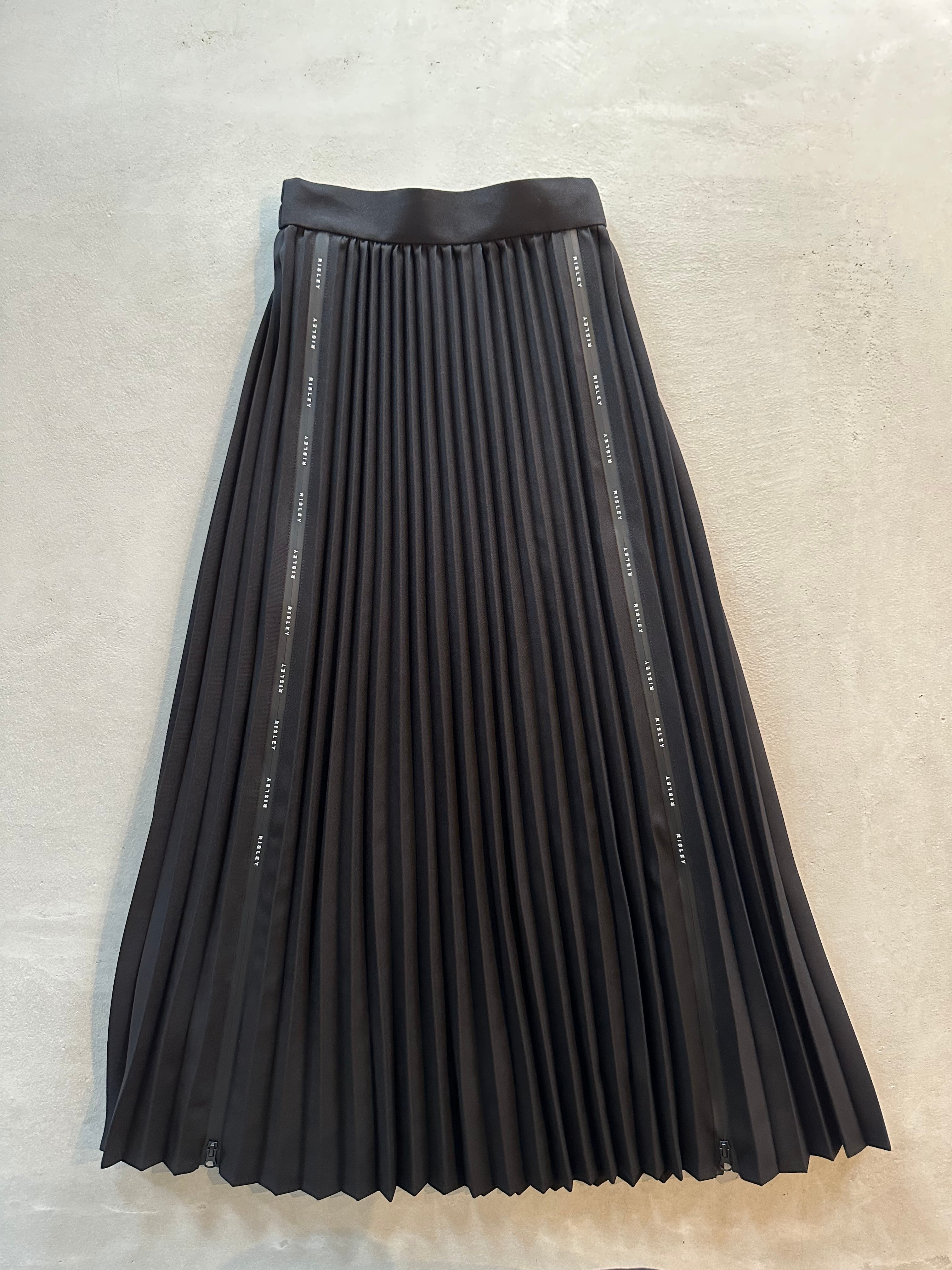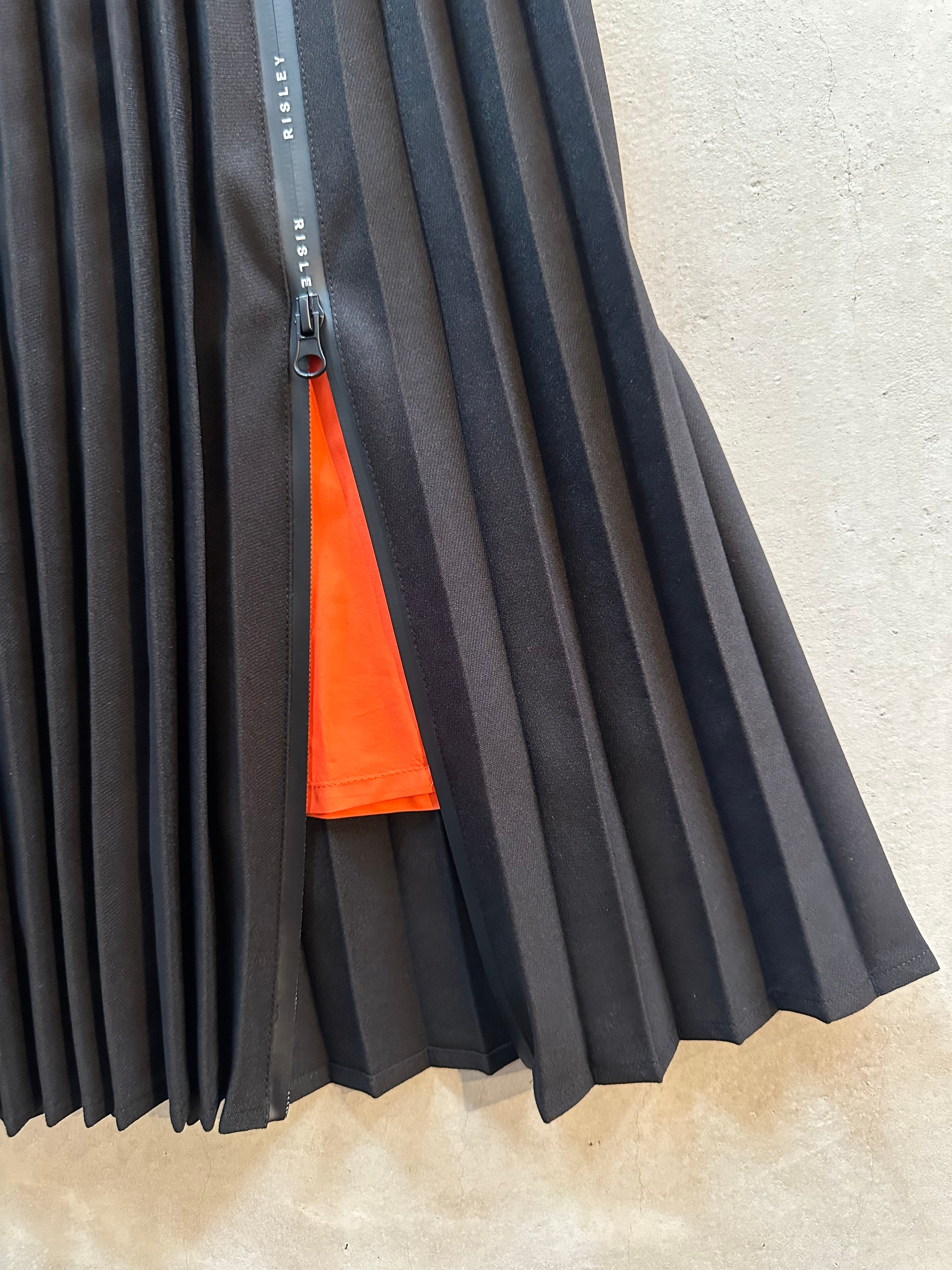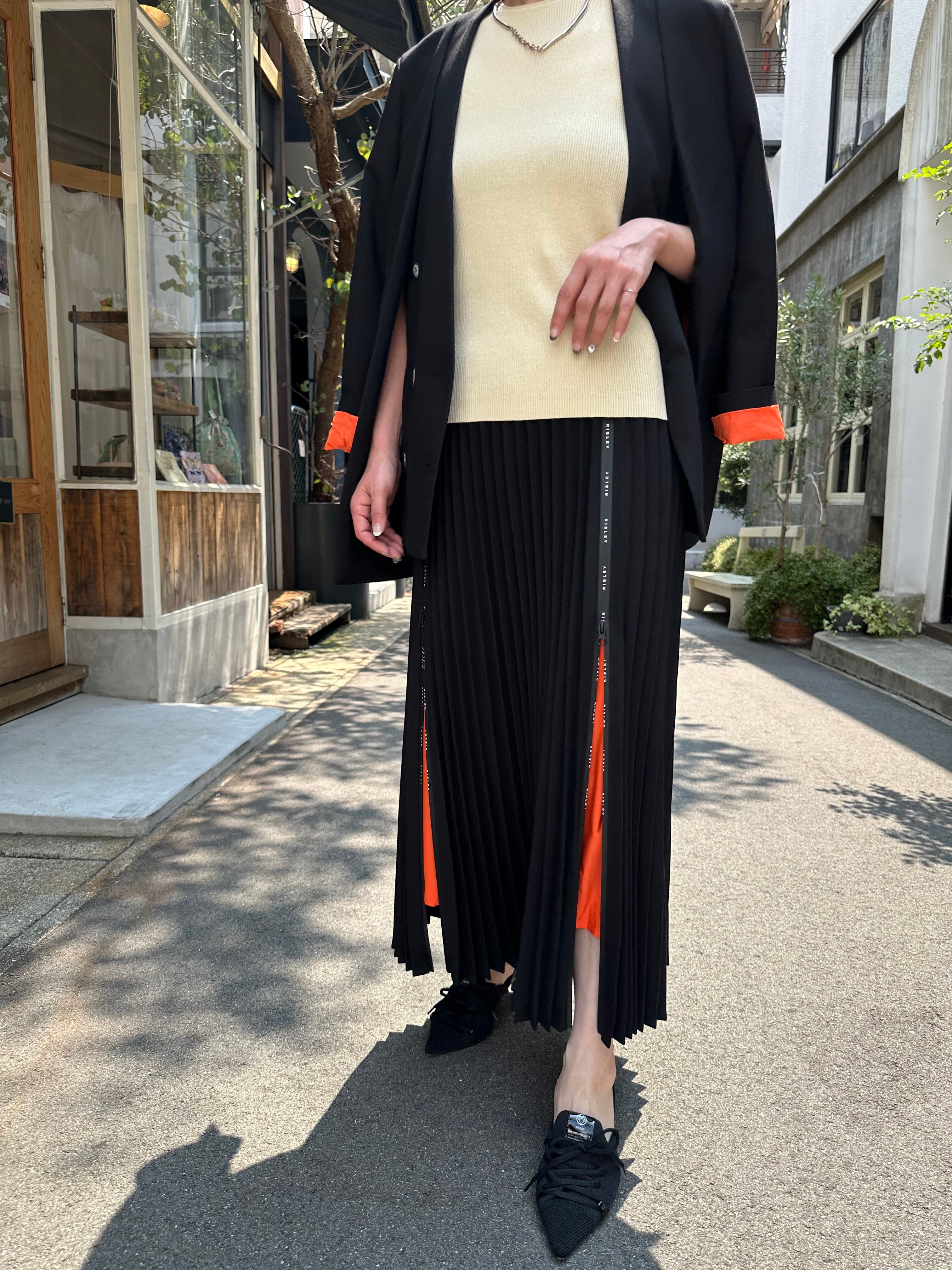 華やかな印象のアコーディオンプリーツを使用した、ロングスカート。フロント両サイドに配されたロゴファスナーは上部まで大きく開き、ペチコートのオレンジインナーカラーを差し色として見せることができます。プリーツの縦ラインで脚長効果も期待できます。