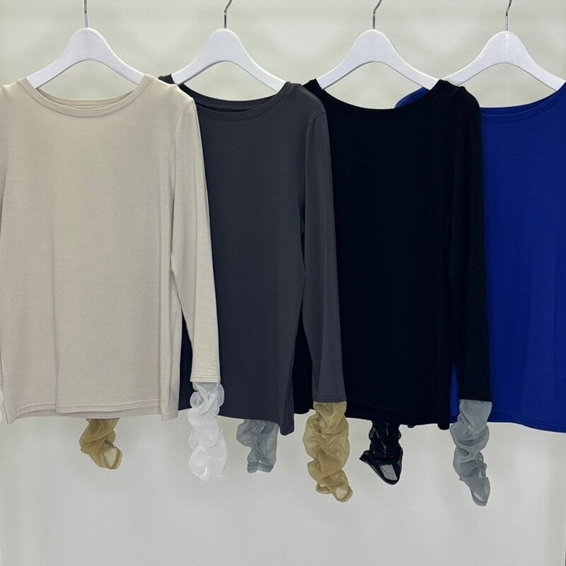 シアー部分が女性らしいフェミニンな印象で、袖口からシアー部分を出すスタイリングが可愛い1枚です。