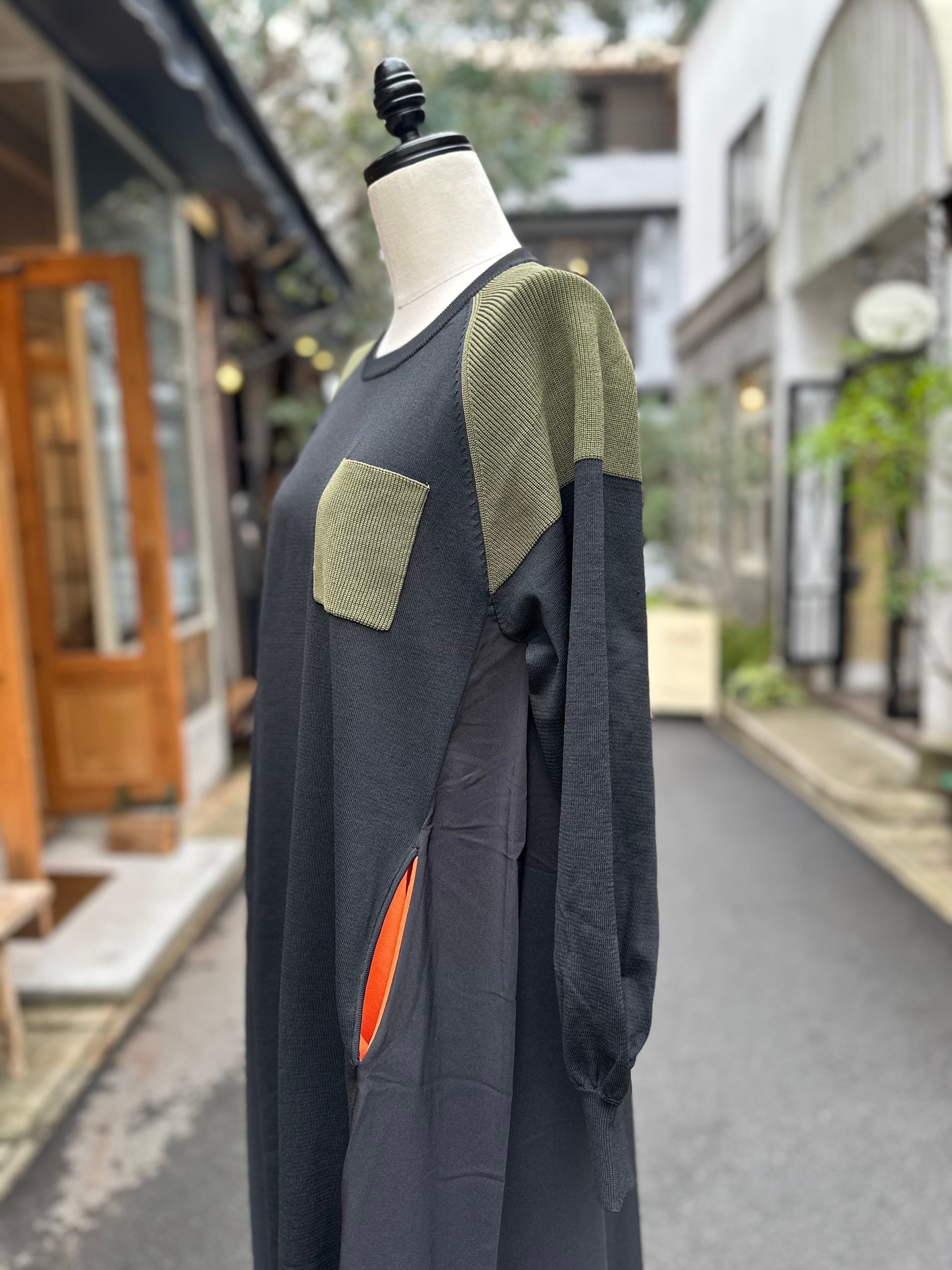 ニットの編み地と布帛生地で切り替えのあるAラインワンピース。