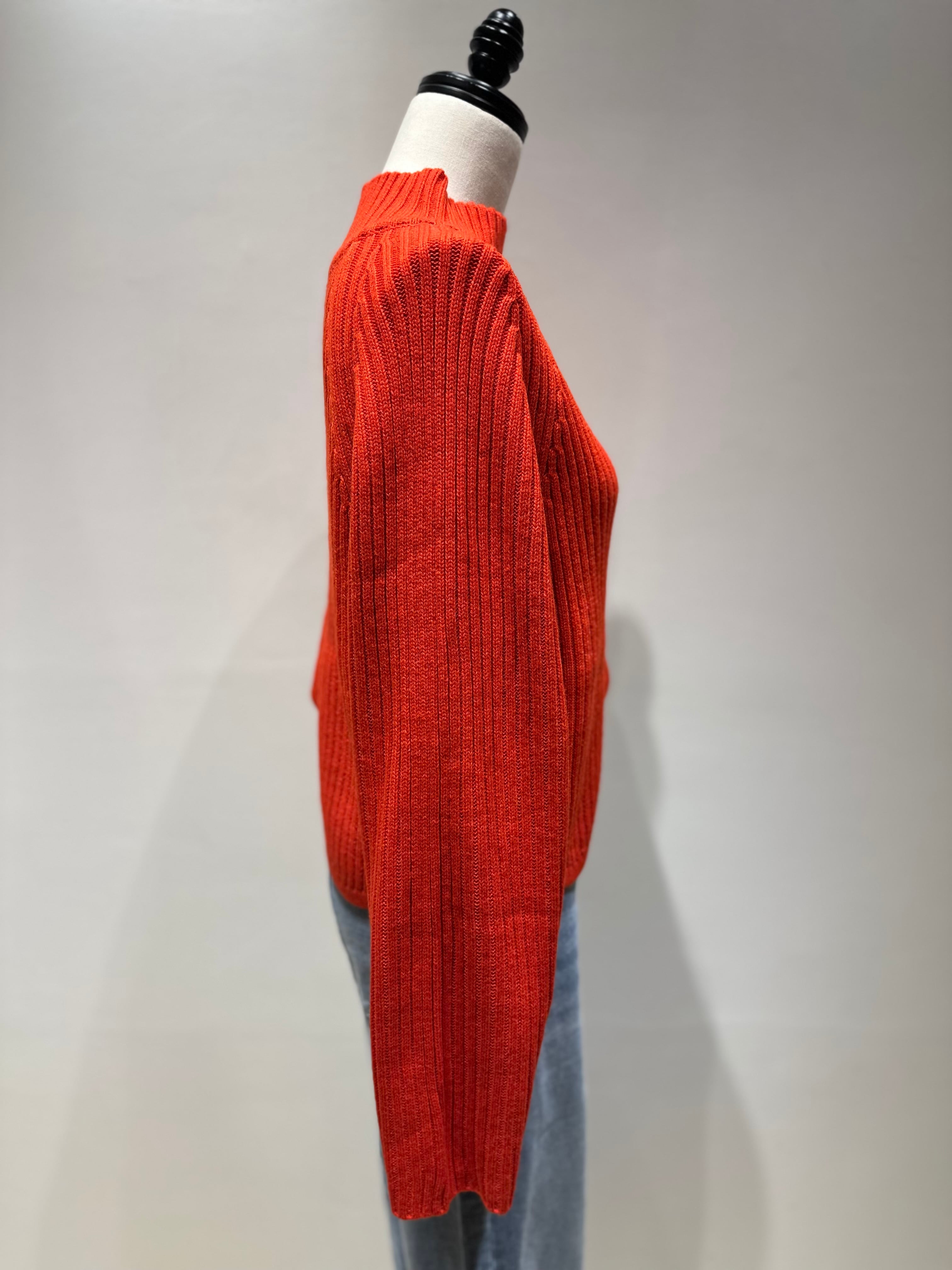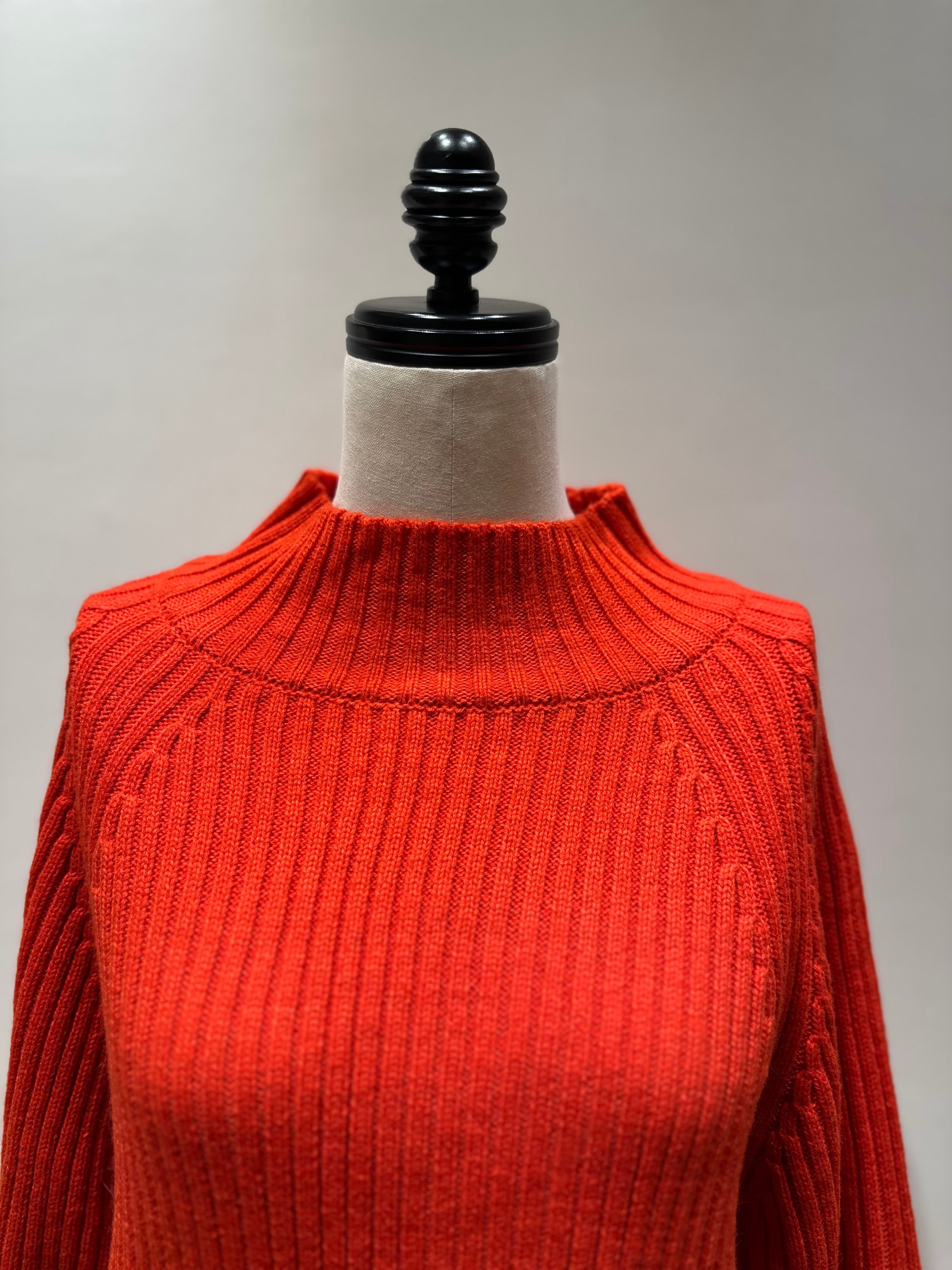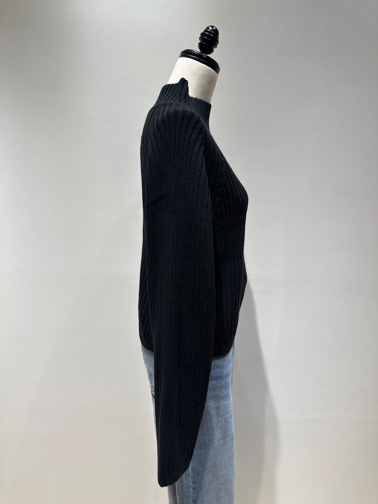 首元はほどよく立ち上がるハイネックで、上品さと抜け感を両立。