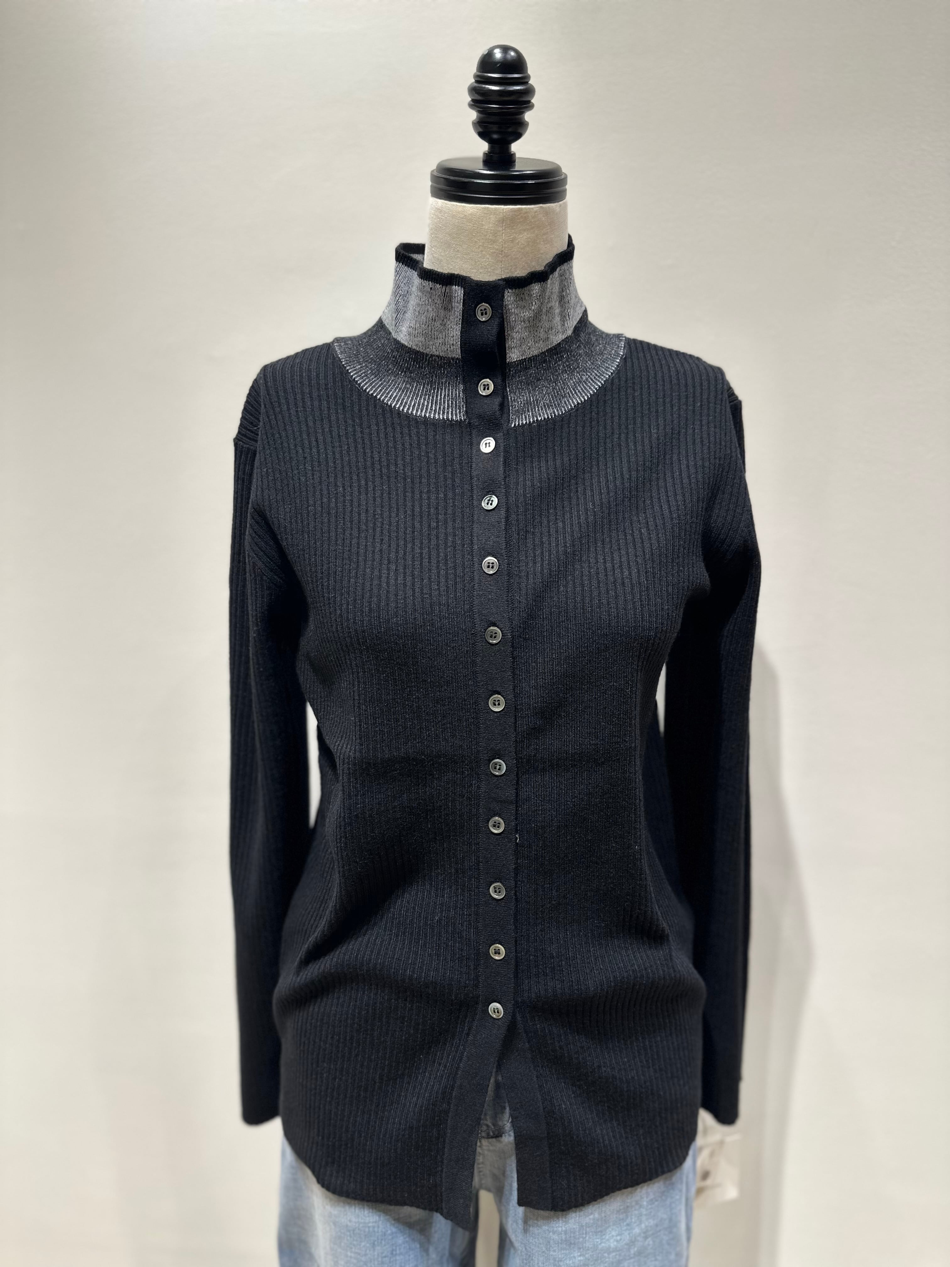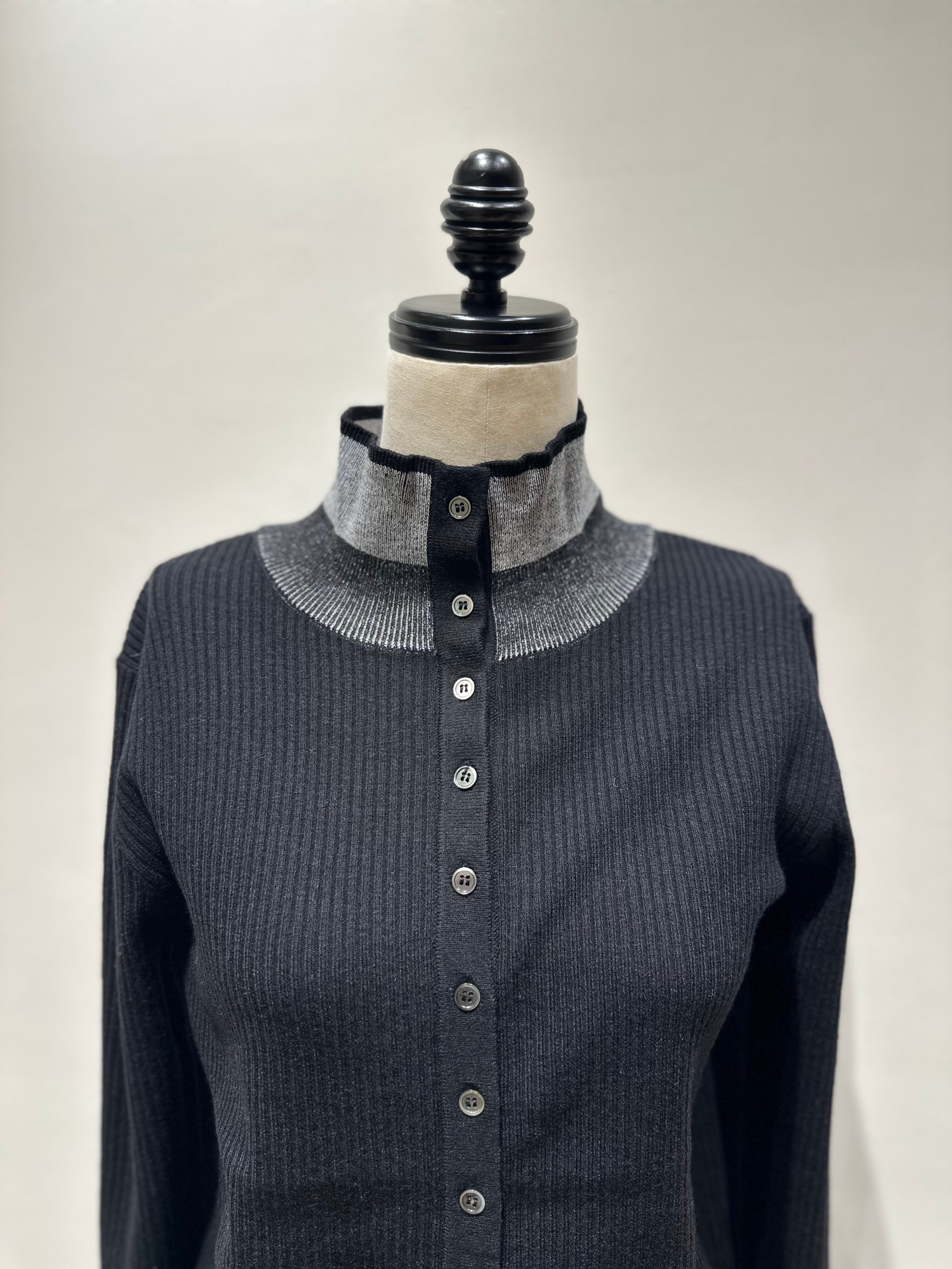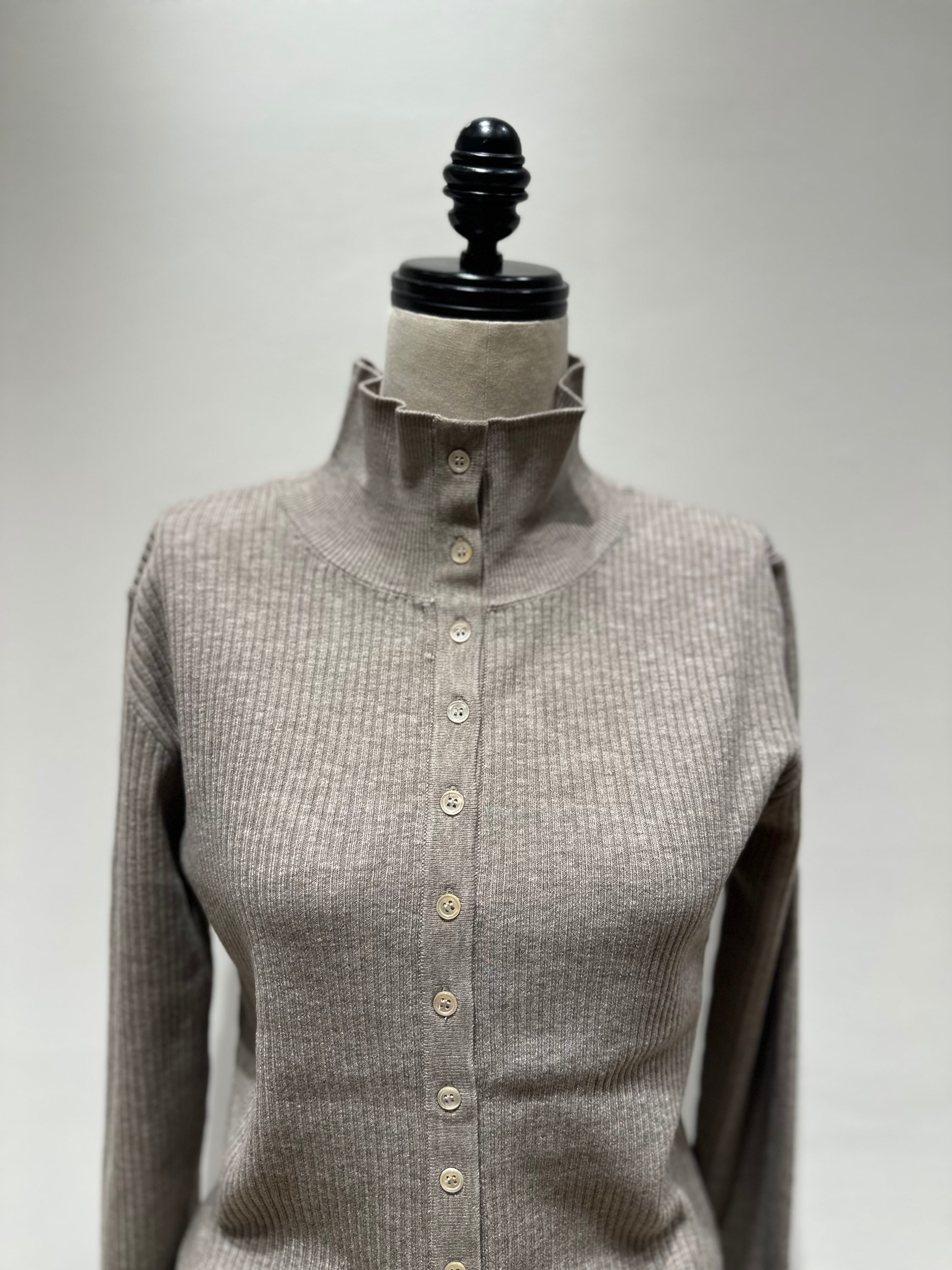 タートルネック部分は折り返したり、衿の釦を開けてシャツのような着こなしも出来るデザイン。