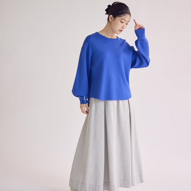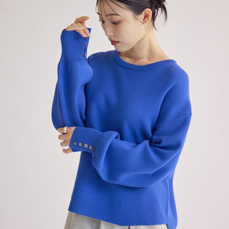 袖口のボタンデザインがポイントのヘムカーブ袖ボタンニット。