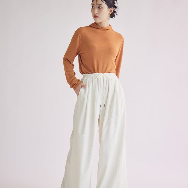 深めのタックが腰まわりに立体感を生み、動きやすさと美しいシルエットを両立。