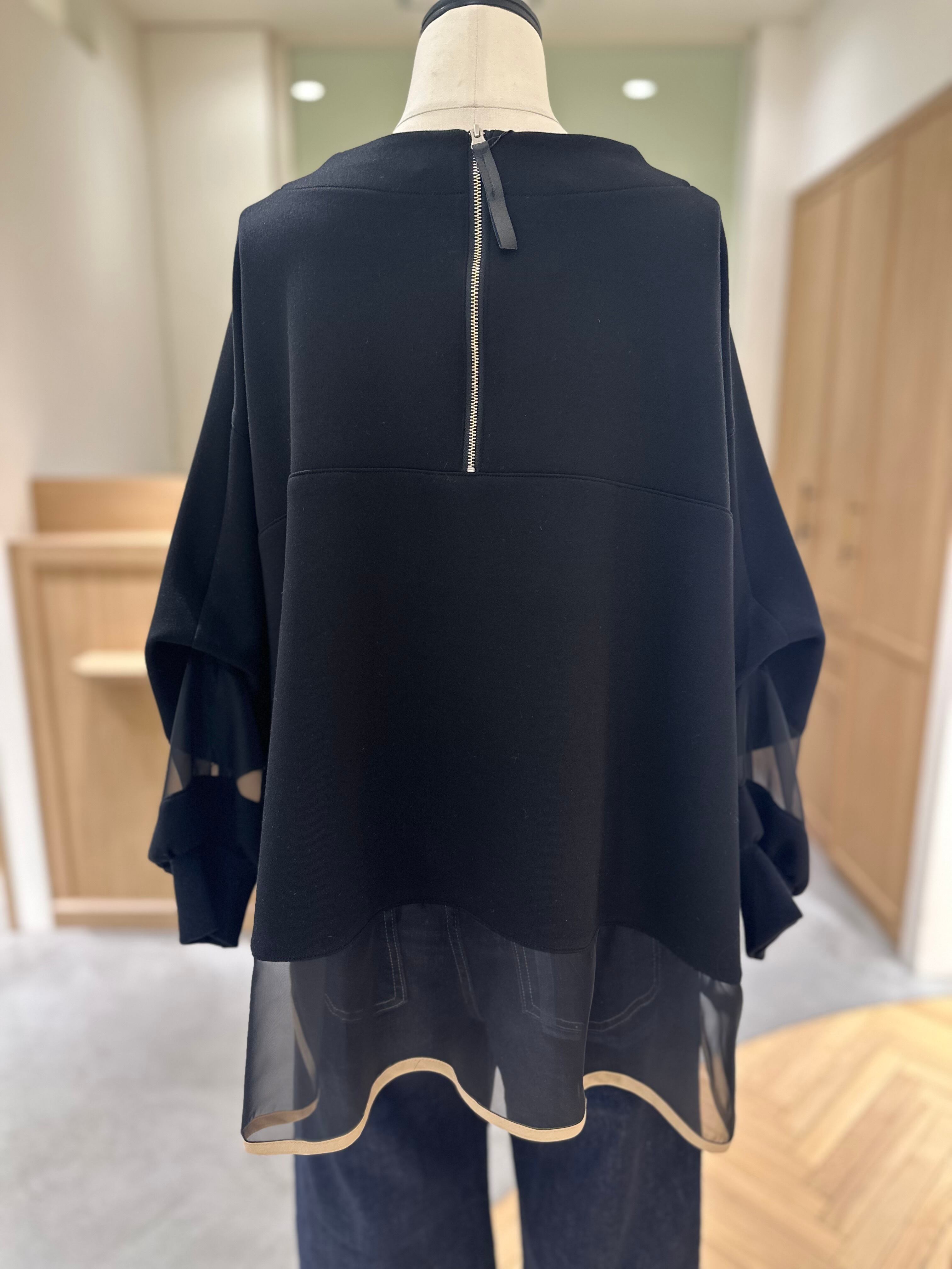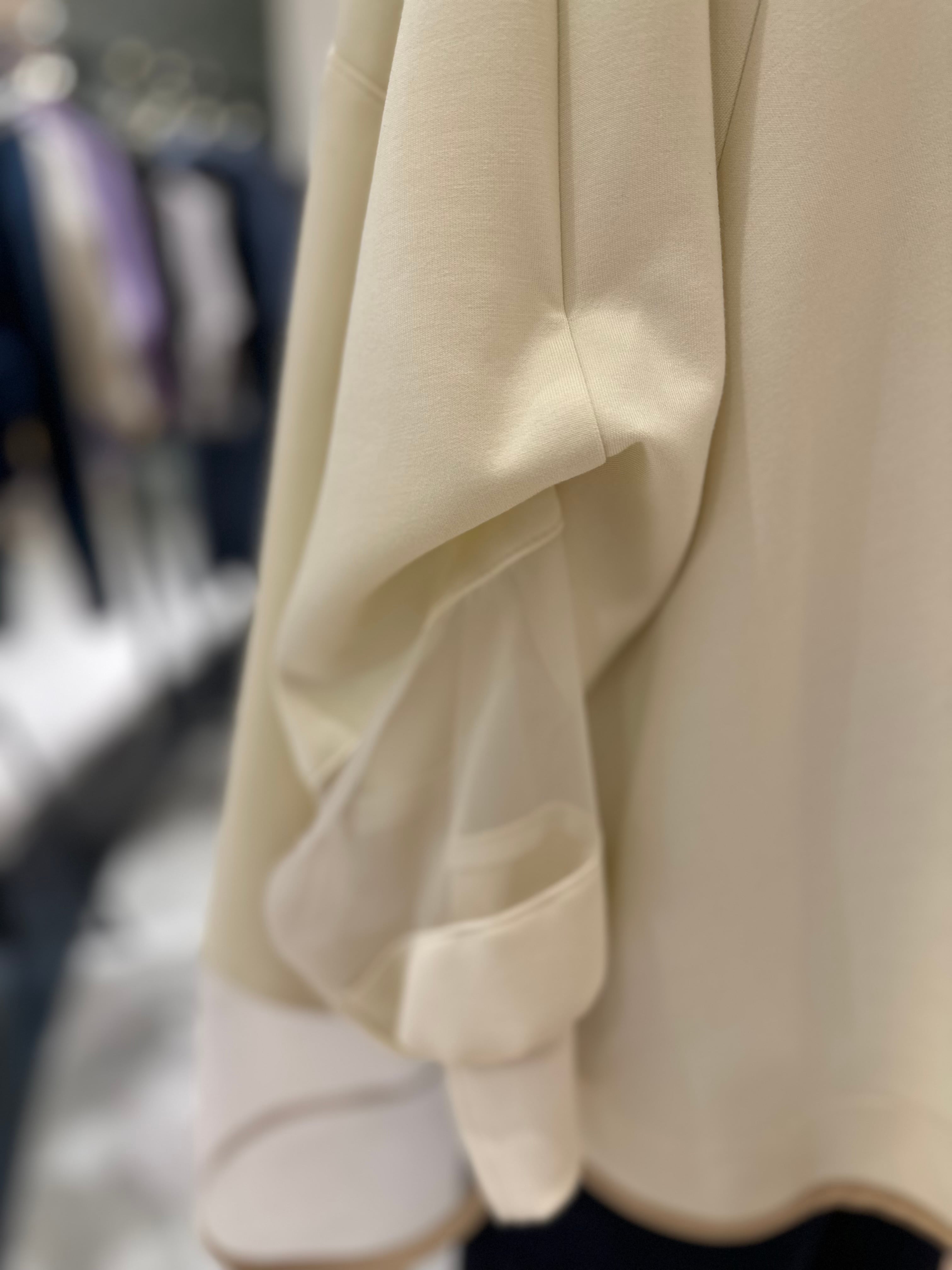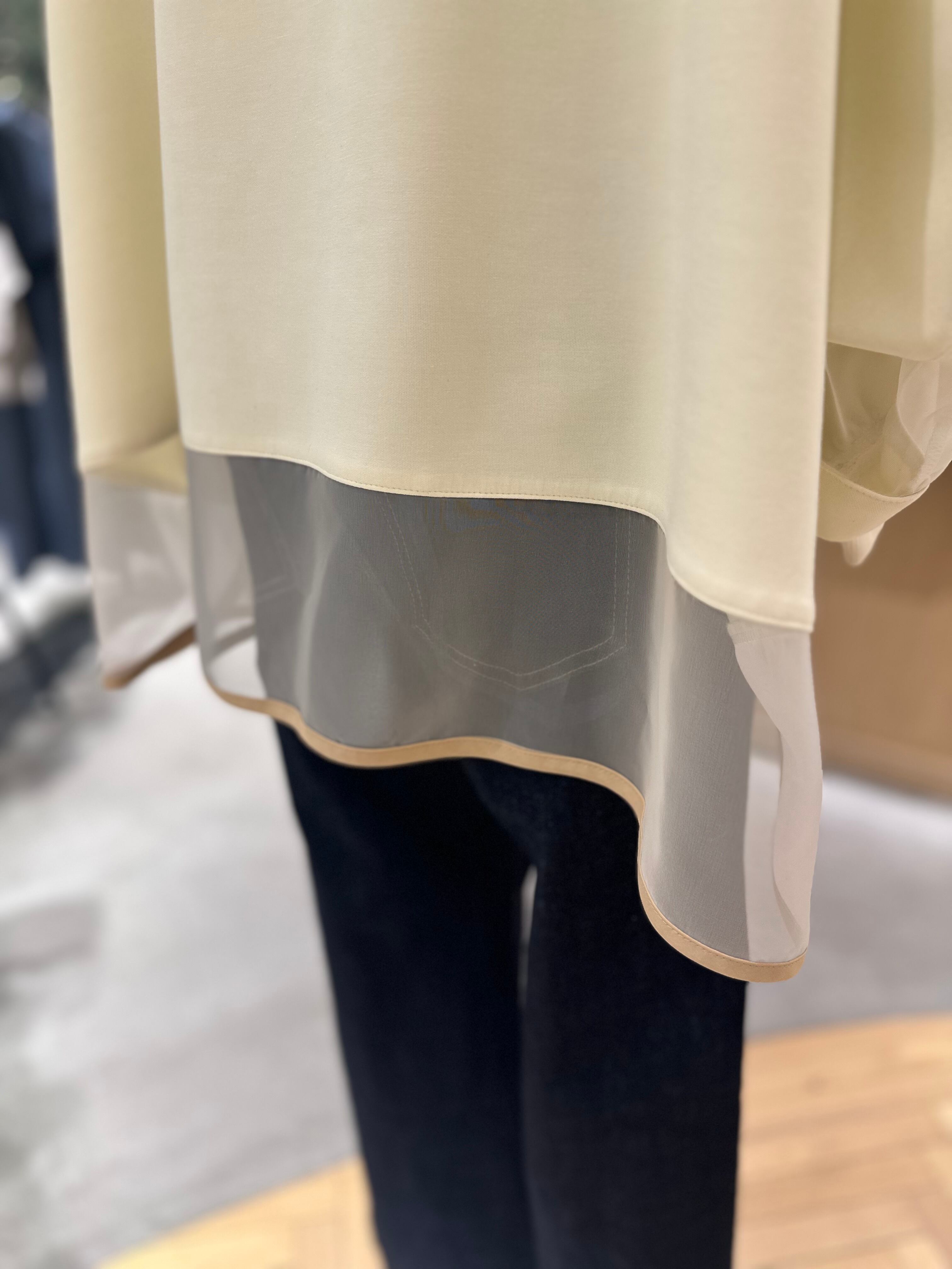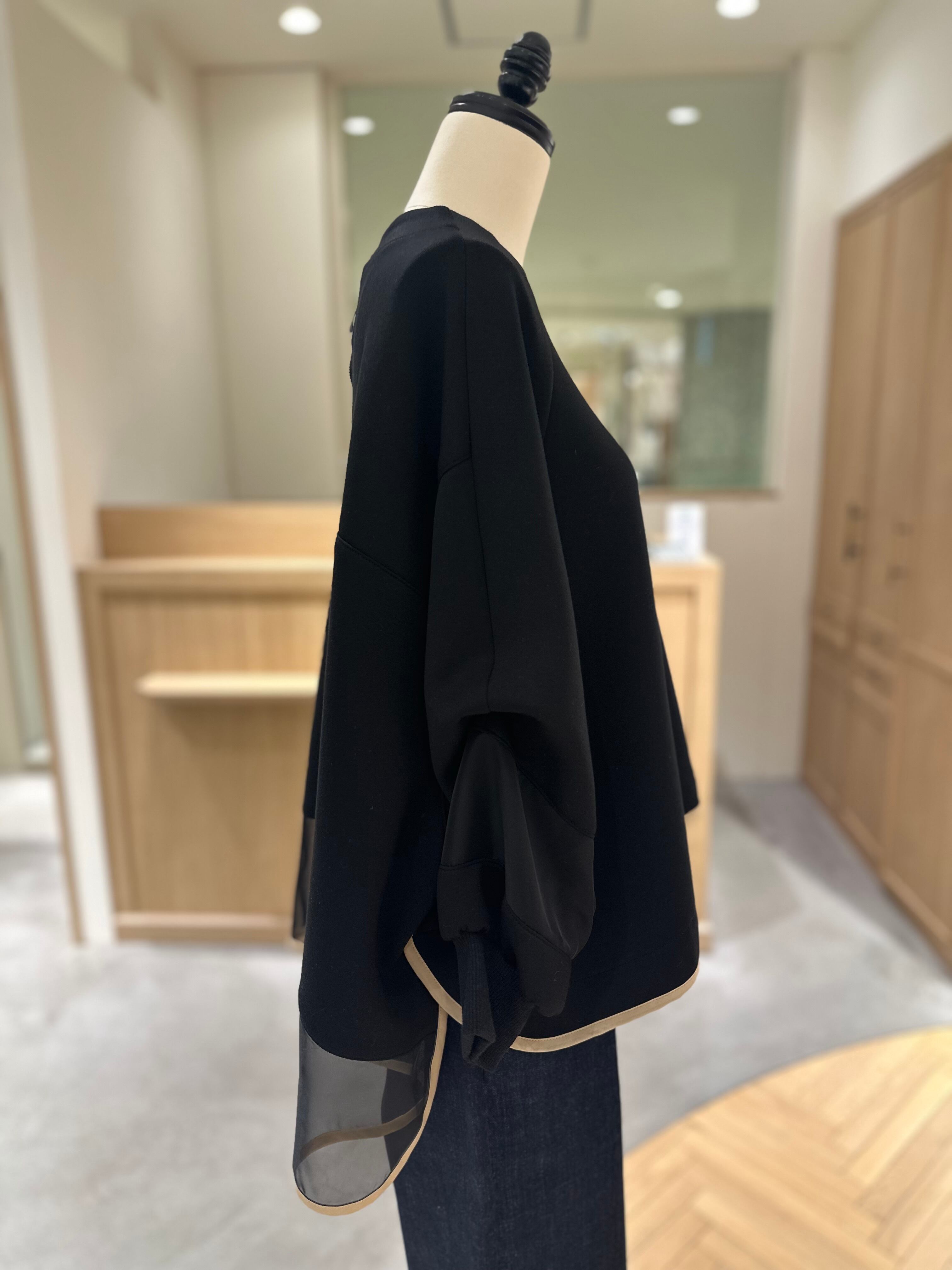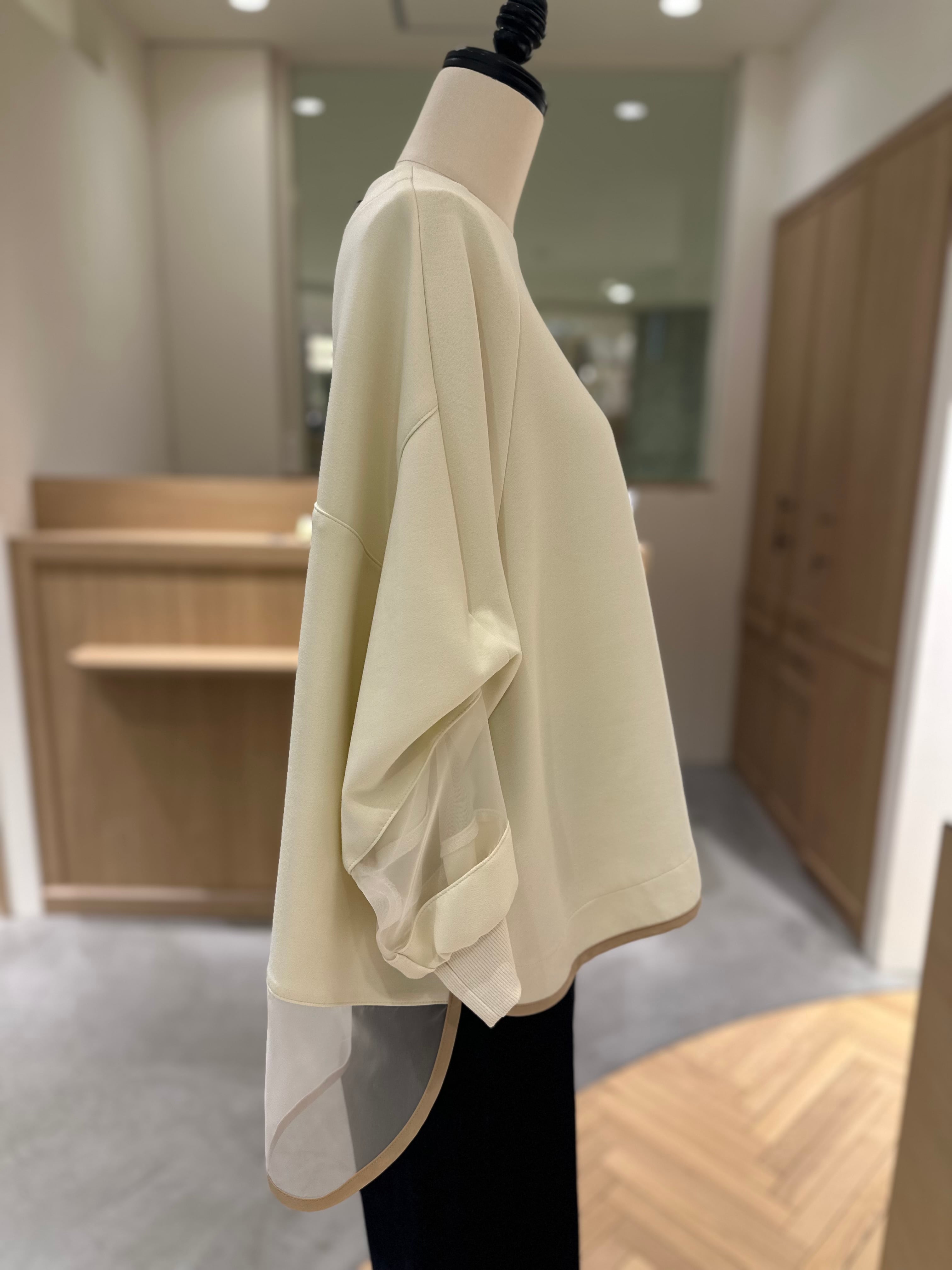 身頃はなめらかな素材で上品に、袖はふんわりとしたシアー切り替えで軽やかさをプラス。