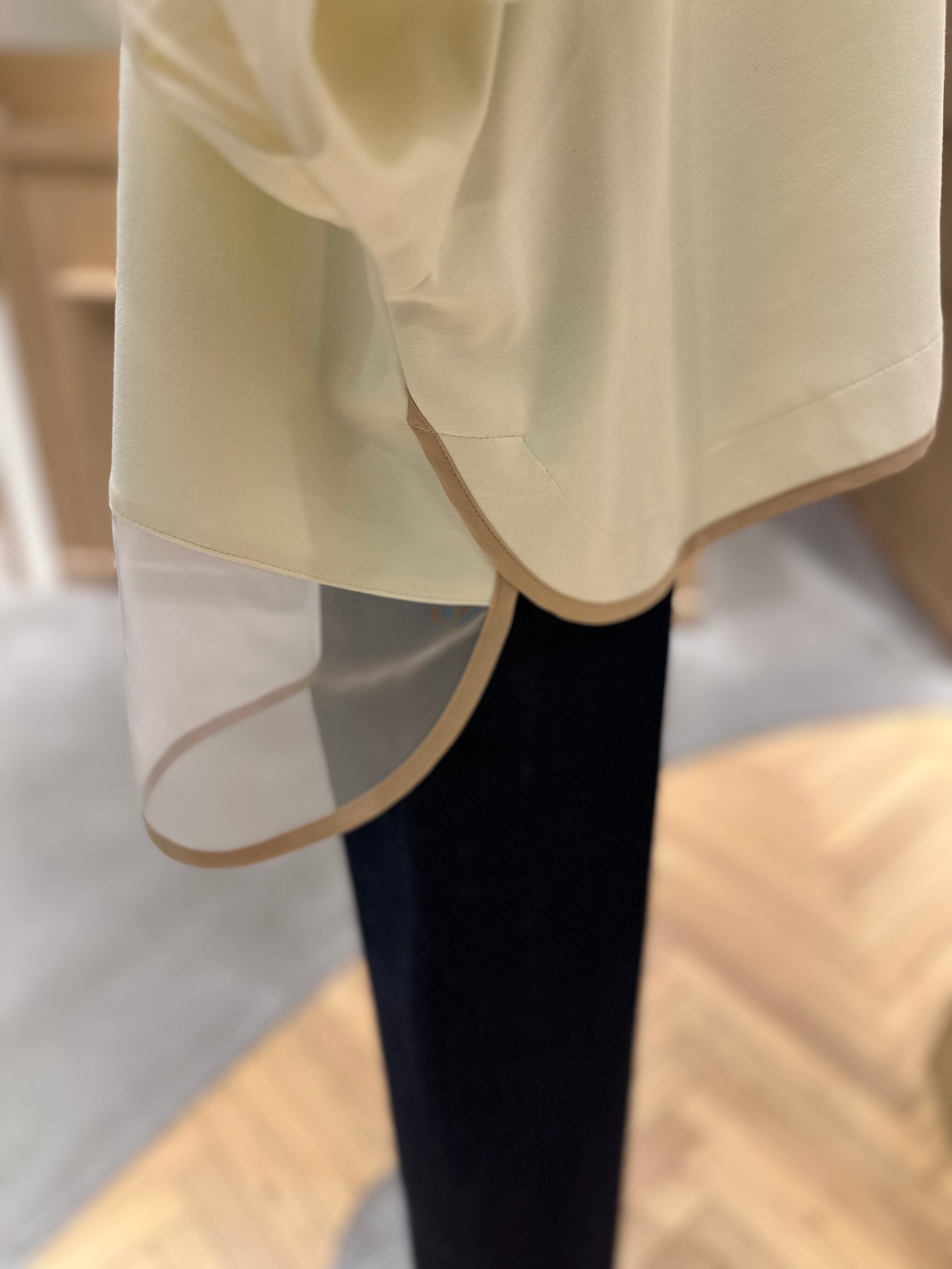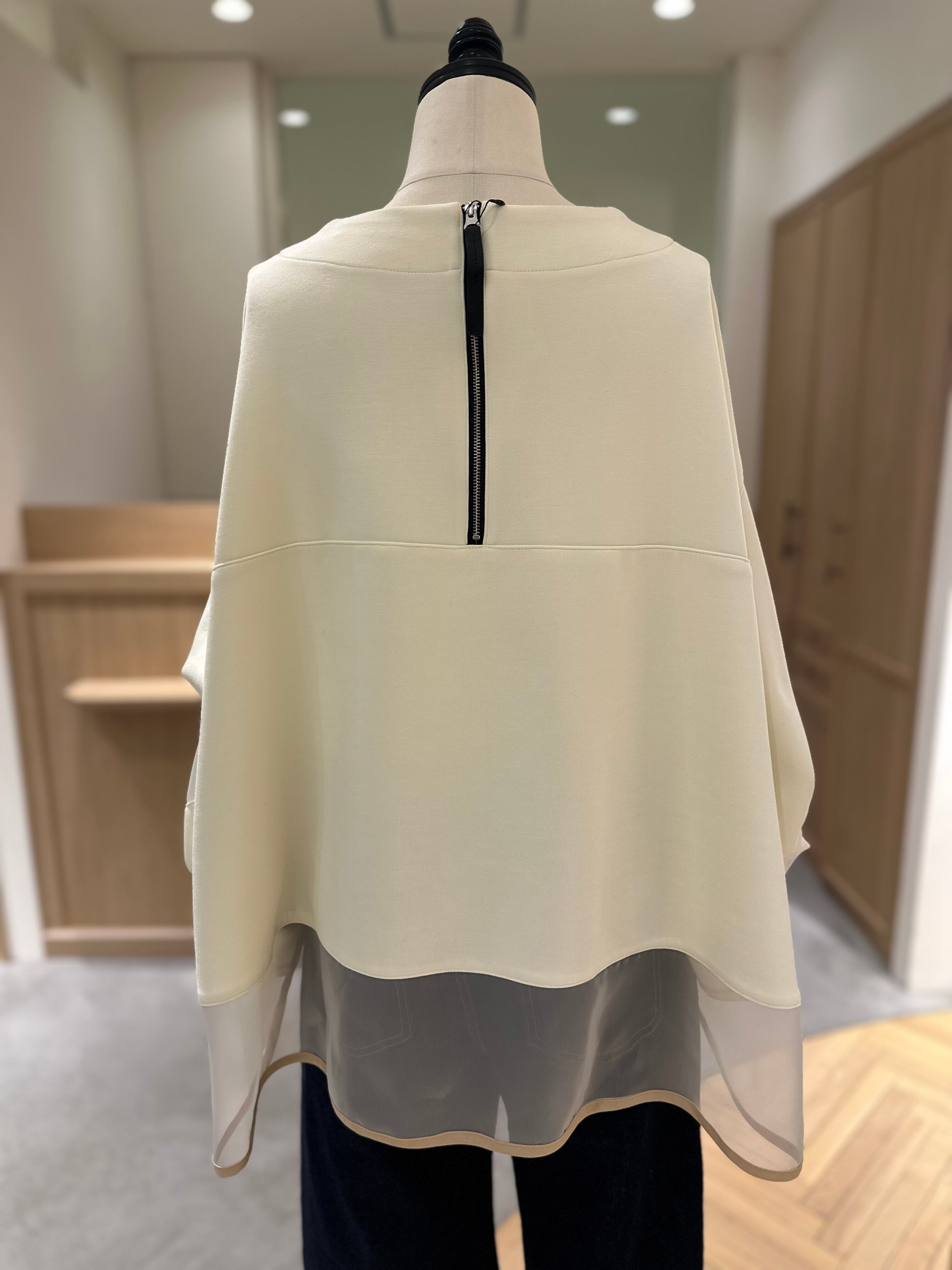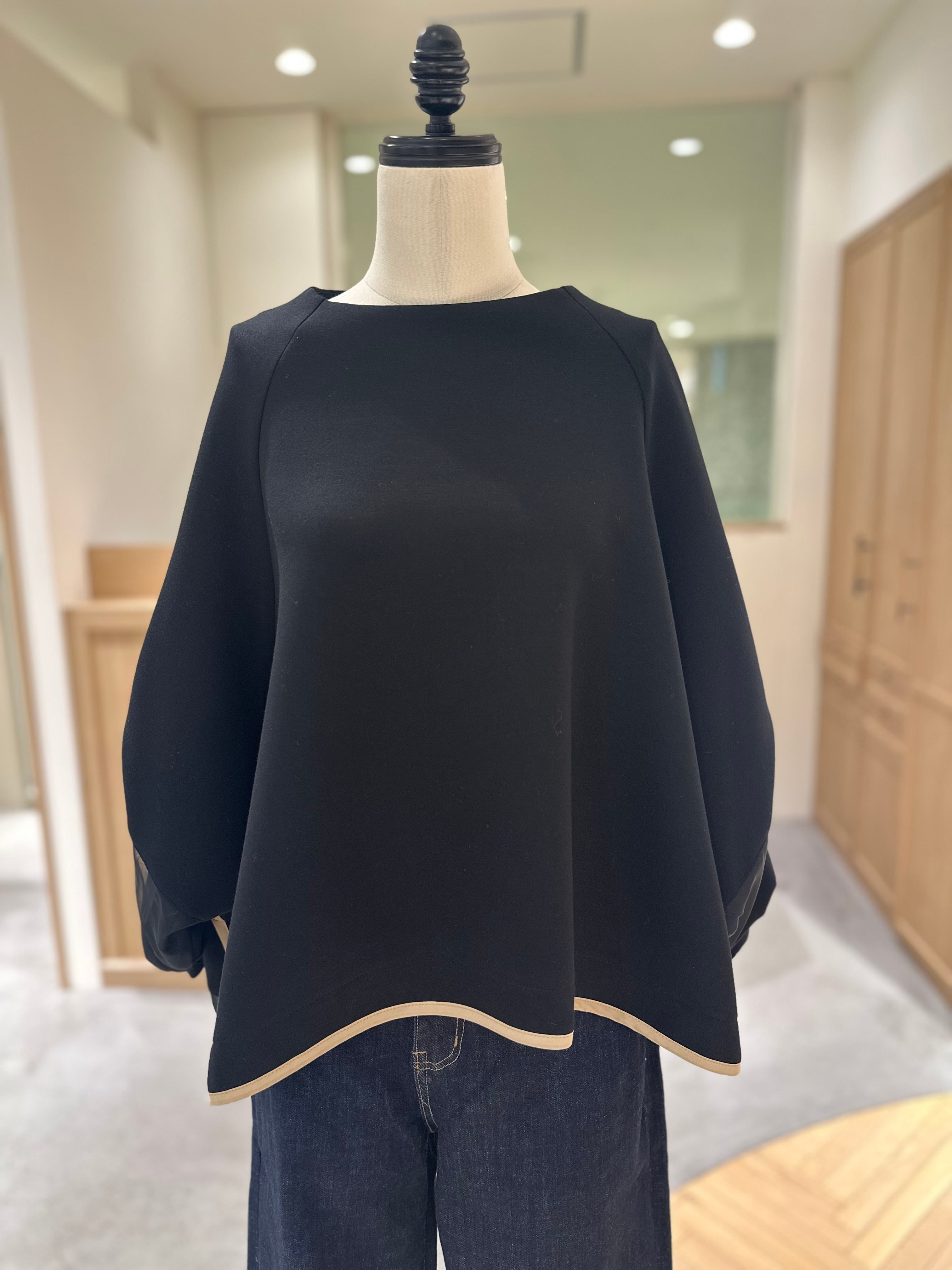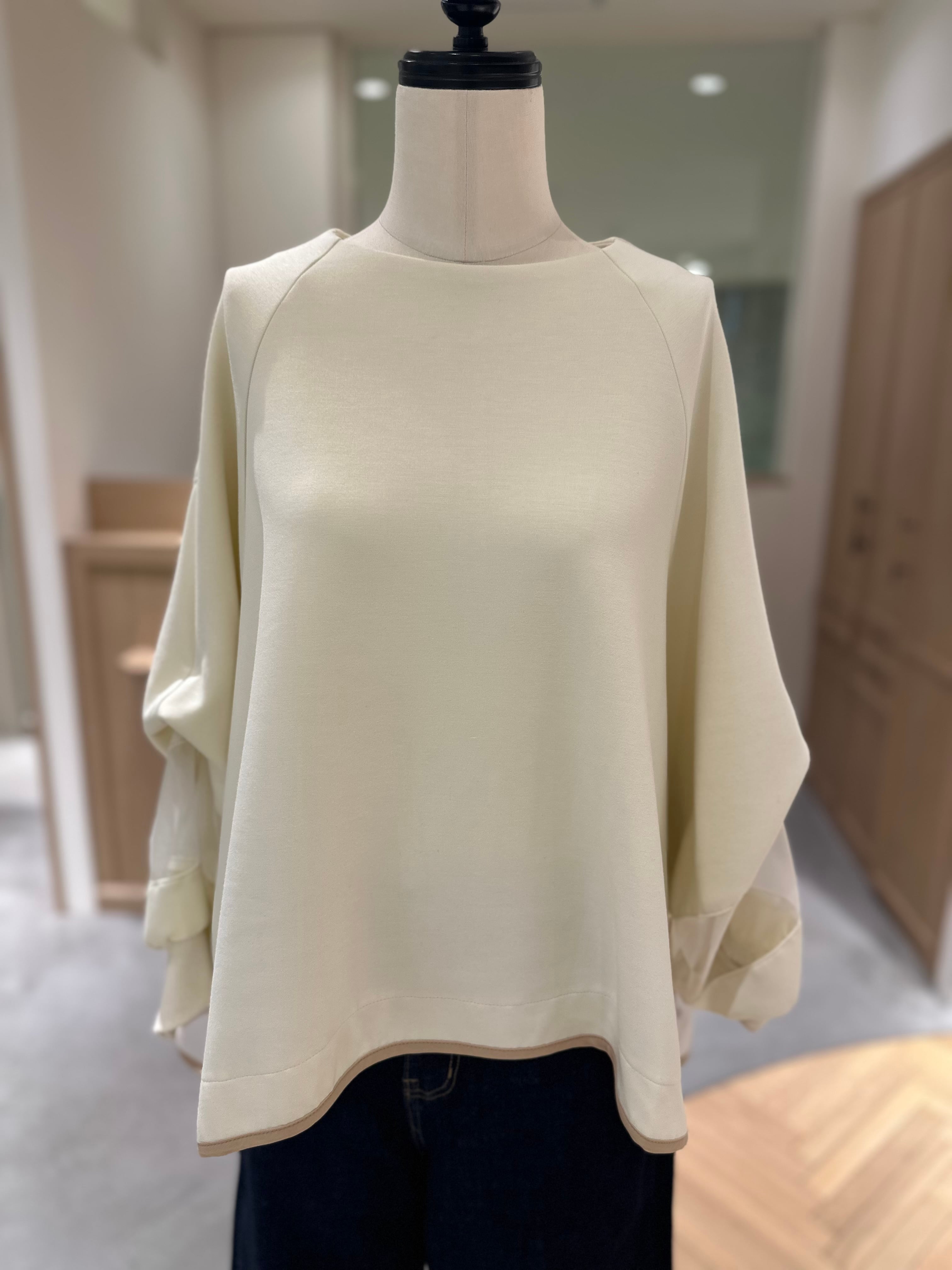 身頃はなめらかな素材で上品に、袖はふんわりとしたシアー切り替えで軽やかさをプラス。