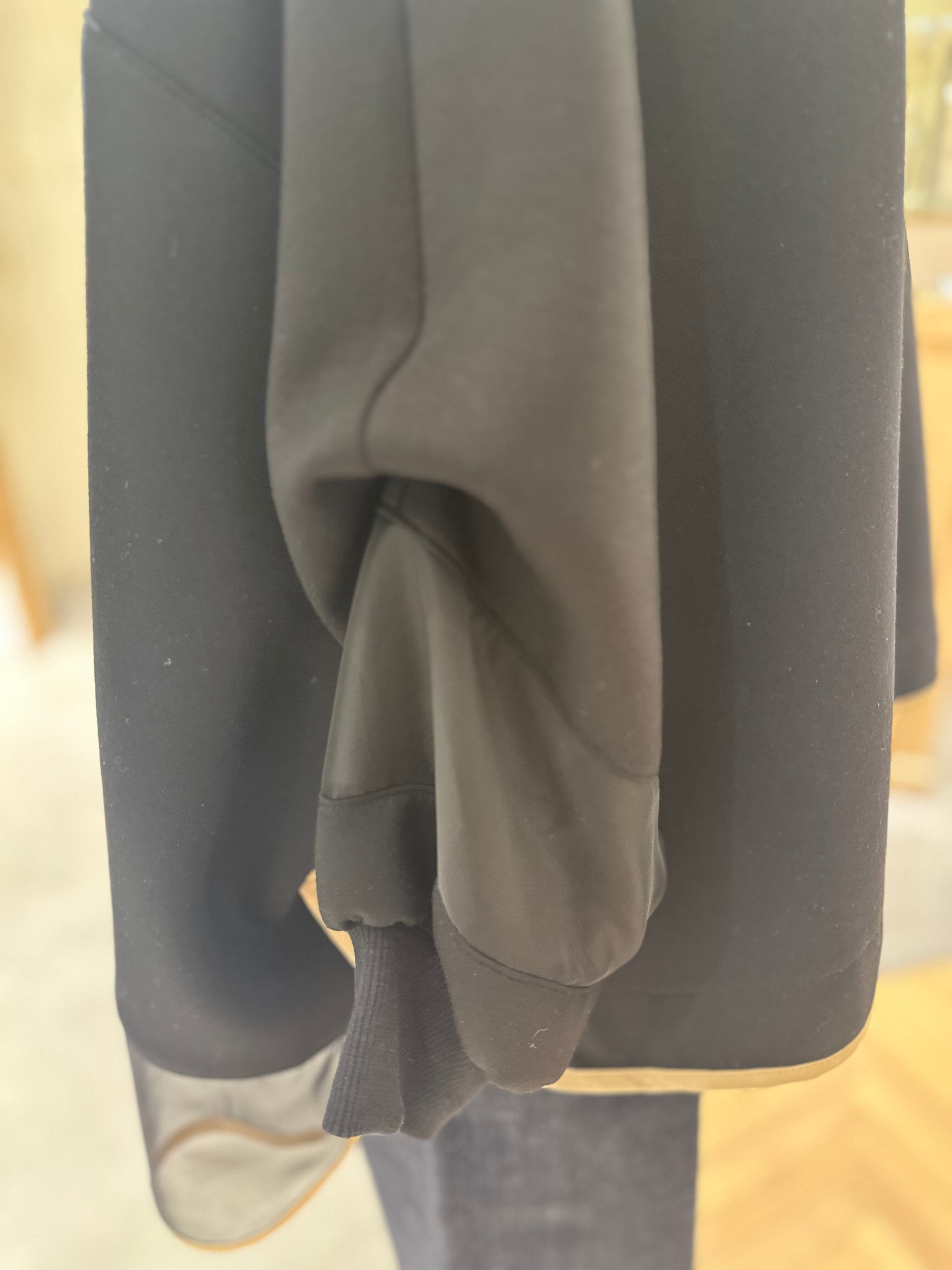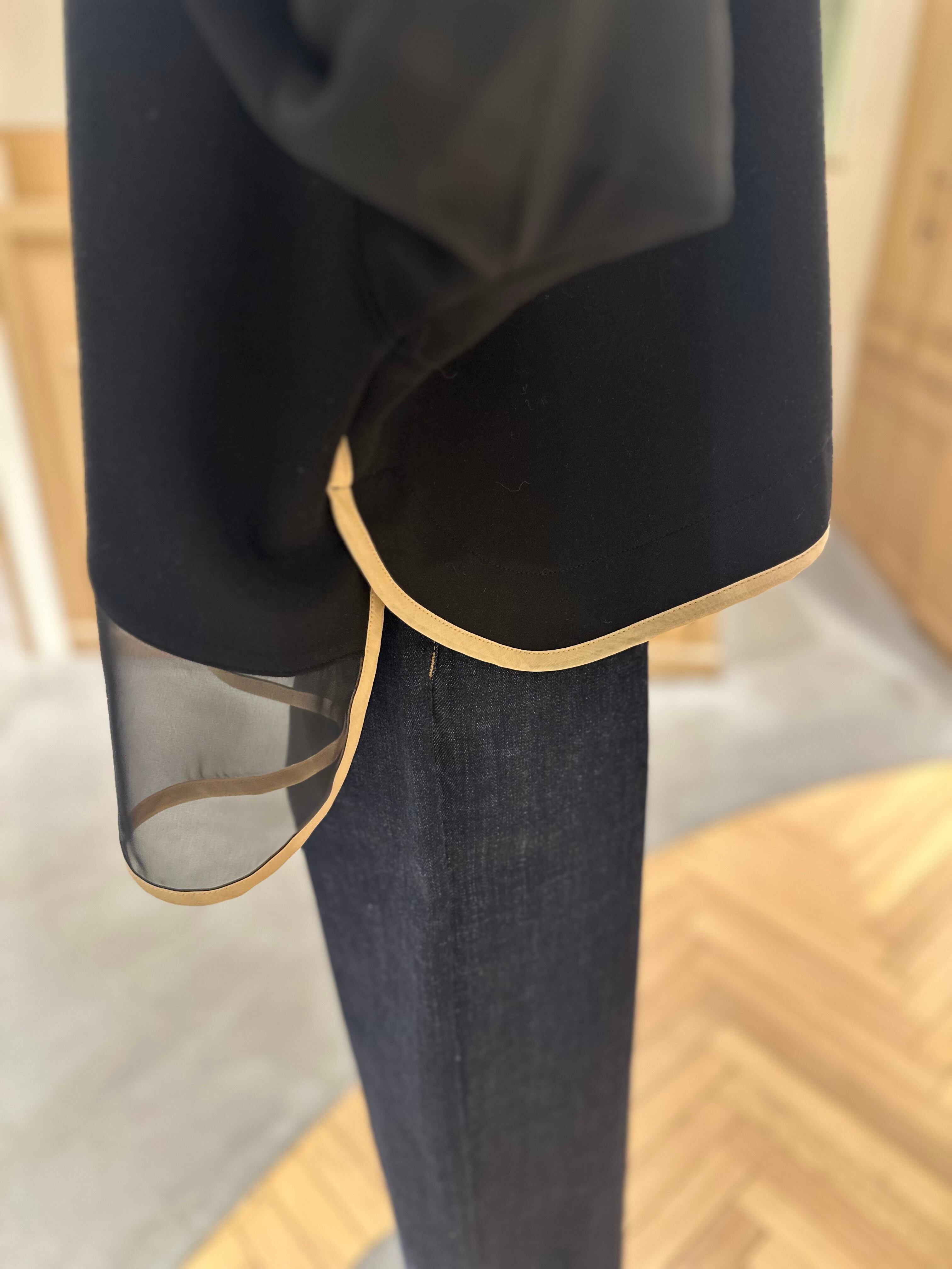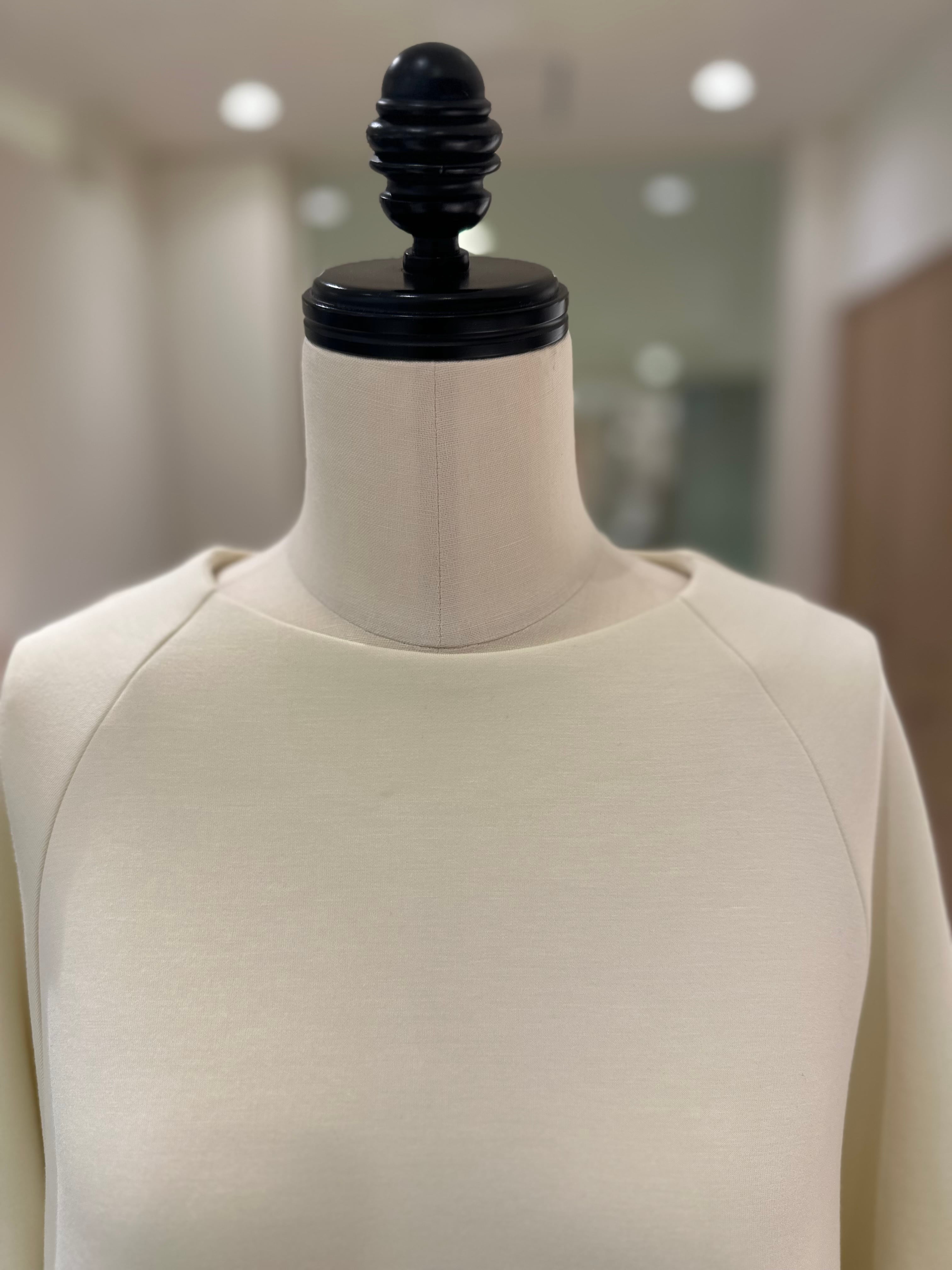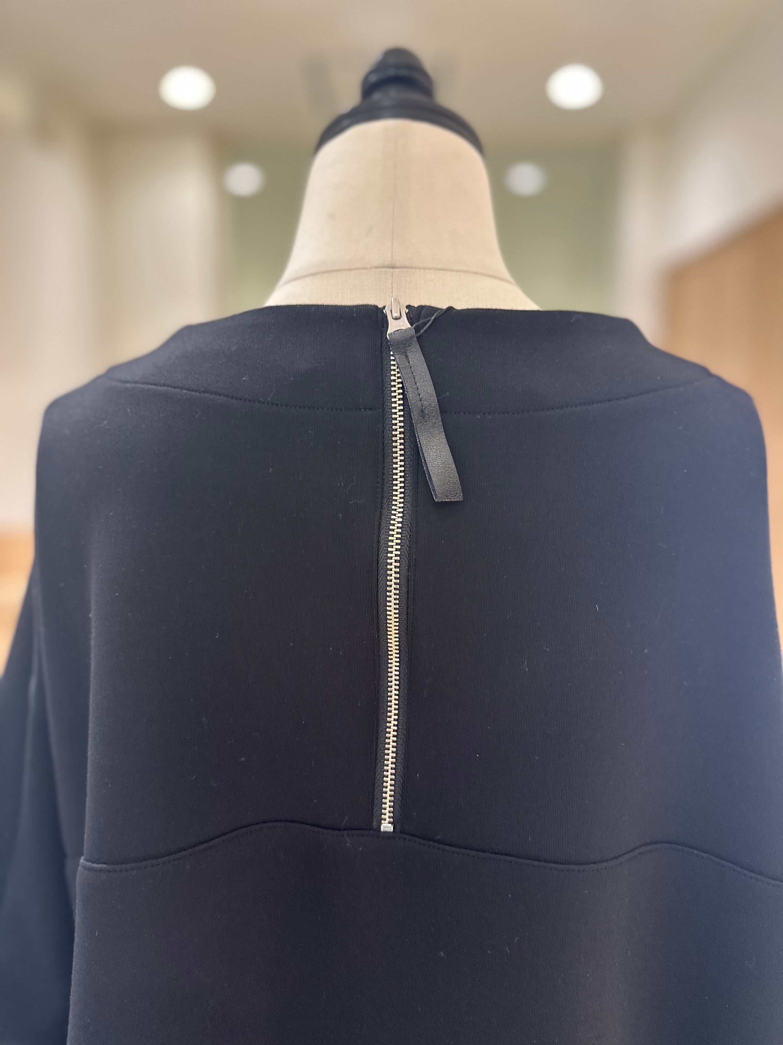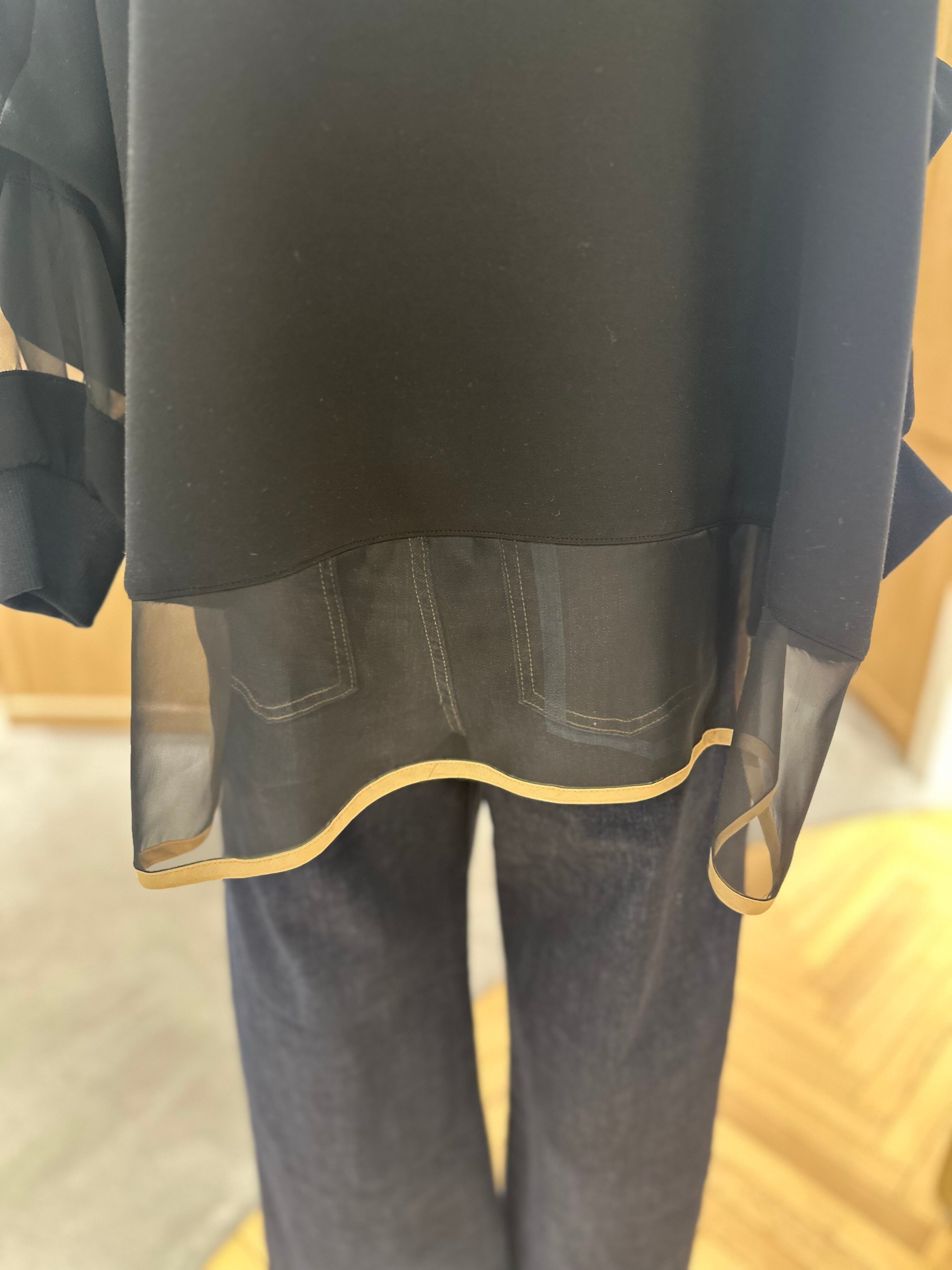 身頃はなめらかな素材で上品に、袖はふんわりとしたシアー切り替えで軽やかさをプラス。